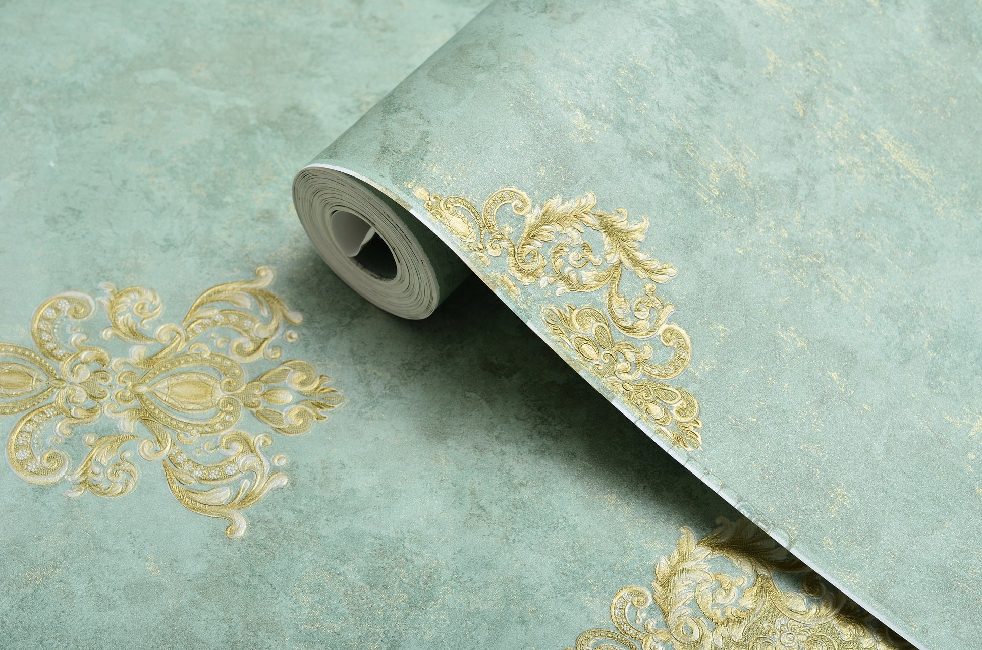 Ce papier peint intissé de la collection Imperium Luxe associe un fond vert sauge texturé à des motifs médaillons dorés embossés, pour une ambiance à la fois noble et apaisante. Il évoque le raffinement d’un palais tout en restant moderne et léger.