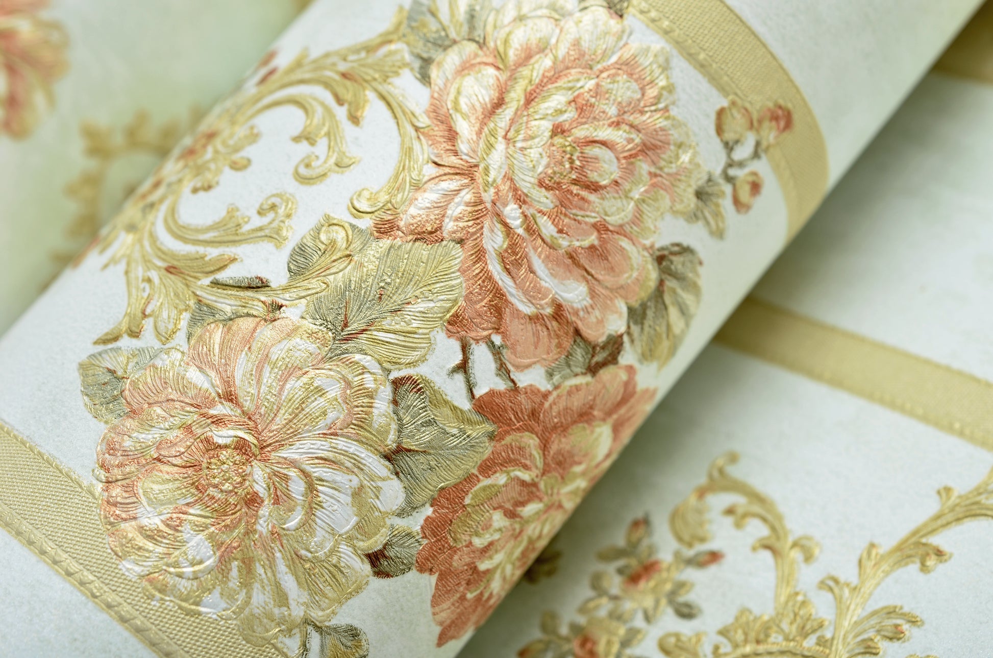 Ce papier peint intissé de la collection Ruban Royal allie un fond bleu pâle lumineux à des rayures verticales dorées et des bouquets floraux d’inspiration baroque. Il évoque la grâce des intérieurs princiers tout en apportant une touche de légèreté moderne.