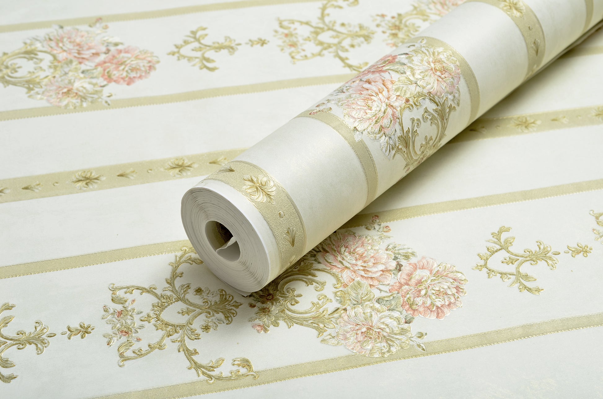 Decopine Papier Peint Intissé Ruban Royal – Rayures Dorées & Fleurs Classiques – Beige Doux – 0,53 x 10m – Sans Colle