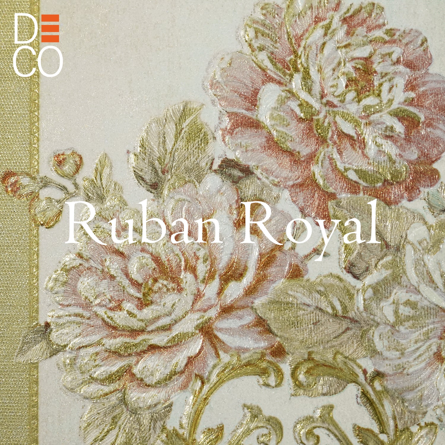 Ce papier peint intissé de la collection Ruban Royal marie un fond beige doux à des rayures dorées et des bouquets floraux raffinés, évoquant l’esprit d’un intérieur de château tout en restant subtil et lumineux.
